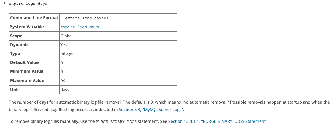 → mysql 5.7.17 'expire_logs_days' docs (참고로, mysql 8 버전에서는 binlog_expire_logs_seconds 변수로 '초'단위로 설정한다.)